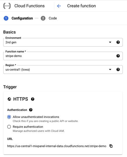 Create a new Cloud Function, set the trigger to HTTPS, and check the box to Allow Unauthenticated Invocations, since this will be called from Stripe. Copy the URL, which should look something like https://<zone>-<your-gcp-project>.cloudfunctions.net/stripe-demo.